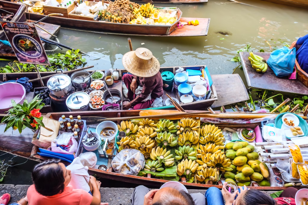 De drijvende markten van Thailand geven een unieke en kleurrijke inkijk in de traditionele Thaise cultuur en handel. Lokale verkopers bieden verse producten, handgemaakte souvenirs en streetfood aan vanaf smalle houten boten op de kanalen. De Damnoen Saduak Floating Market, net buiten Bangkok, is de bekendste en trekt zowel toeristen als locals. Een rustigere en meer authentieke optie is de Amphawa Floating Market, geliefd om zijn heerlijke zeevruchten en lokale charme.